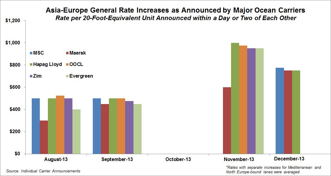 Asia-Europe carriers have announced at least 34 rate increases since 2009, according to Alphaliner, which said that in most cases, the timing and amount of the increases were “largely similar” for all the main carriers, with announcements made by carriers within a few days of each other.