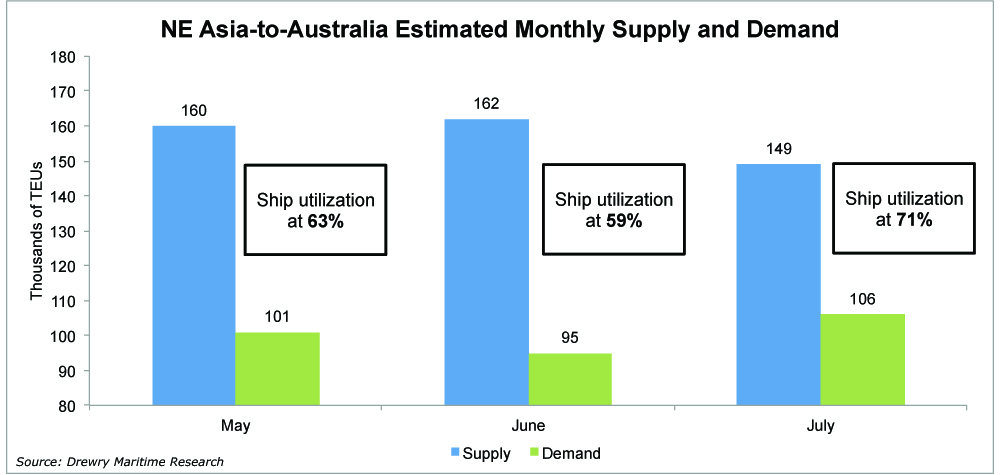 In July, southbound container traffic from Northeast Asia to Australian ports totaled 105,500 TEUs, Drewry said, up 0.8 percent year-over-year. Backhaul traffic has grown 2.6 percent year-to-date, according to Container Trade Statistics data.