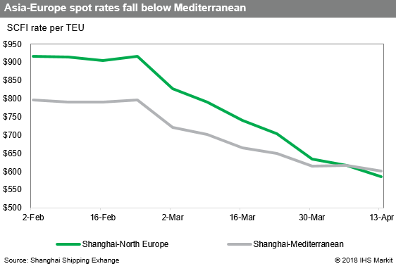 According to IHS Markit data, the global container fleet is projected to expand 4.7 percent this year, just below the projected 4.9 percent increase in global trade. But demand on Asia-Europe in the second quarter is forecast to grow by about 4 percent, less than half the 8.8 percent increase in capacity that is predicted to enter the trade in that period.