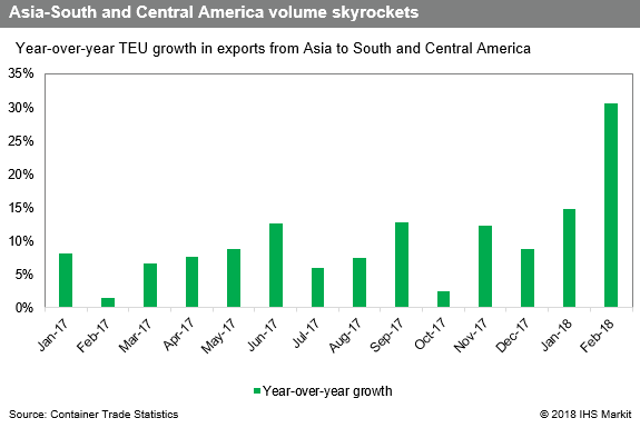Trade from the Far East to South and Central America rose 8.1 percent in 2017 to 3.6 million TEU, according to CTS data. That growth has continued into this year, with volume up 14.8 percent in January and 30.5 percent in February. Growth in the opposite direction came to 8.4 percent and 1.7 million TEU in 2017 and also continued in 2018, with January volume up 5.8 percent and February volume up 9.2 percent.