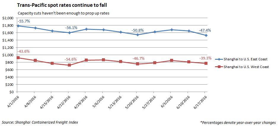 Trans-Pacific carriers are working to make rate increases stick by cutting capacity. China Cosco Shipping, the Ocean Three and the G6 Alliance have all cut services, resulting in a 1 percent drop in trans-Pacific capacity equal to 16,000 TEUs, according to Alphaliner.