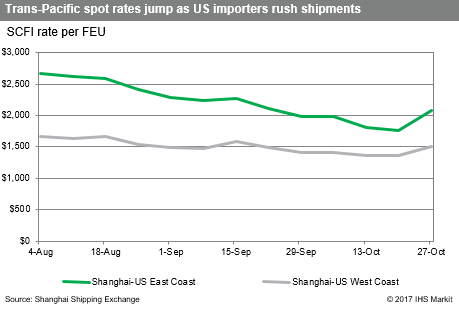 However, compared with last year in late October, the East Coast rate is down 27.1 percent and the West Coast rate is down 38.1 percent. The trade last fall was dealing with the aftermath of the Hanjin Shipping bankruptcy on Aug. 31, 2016.